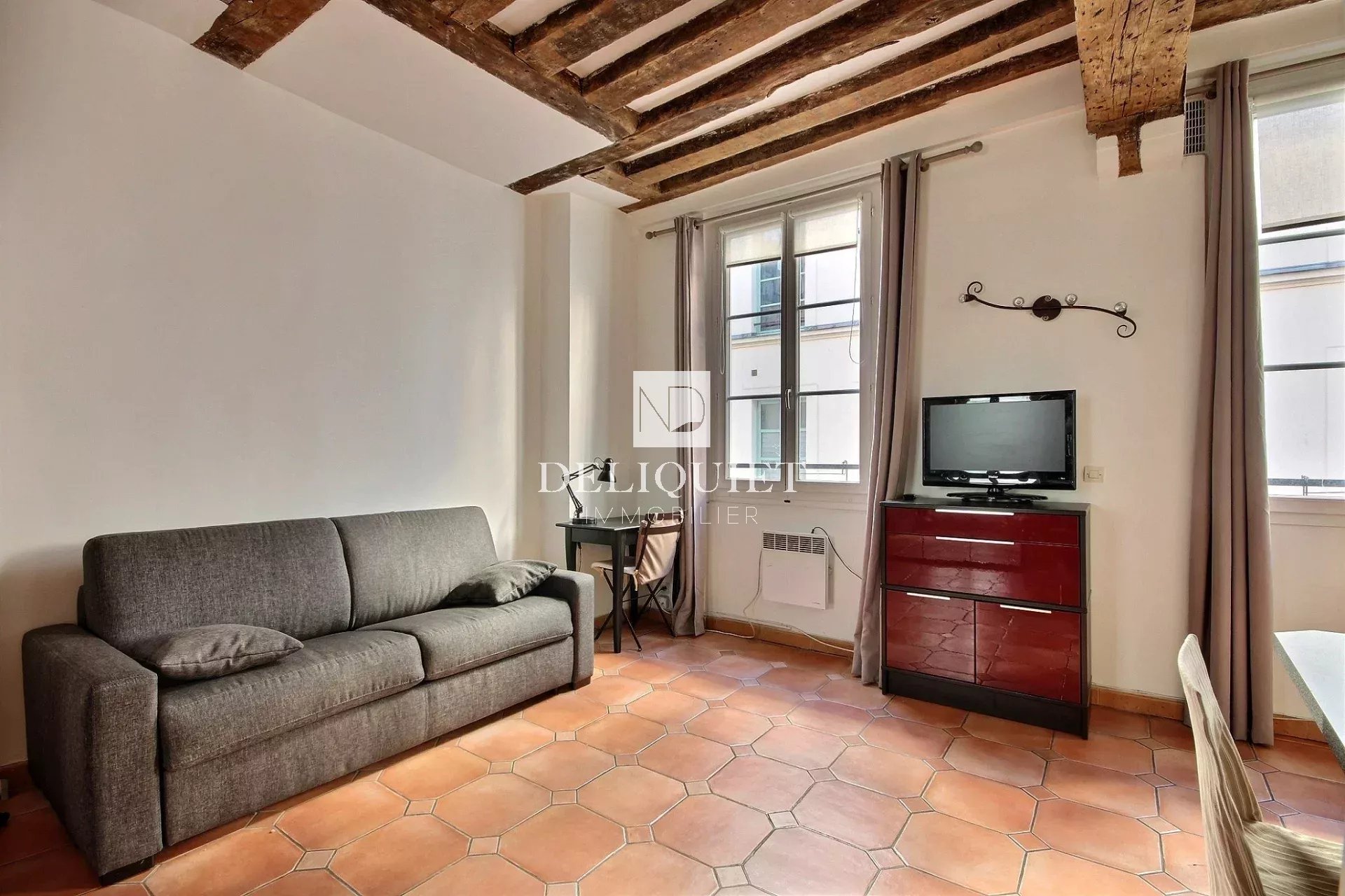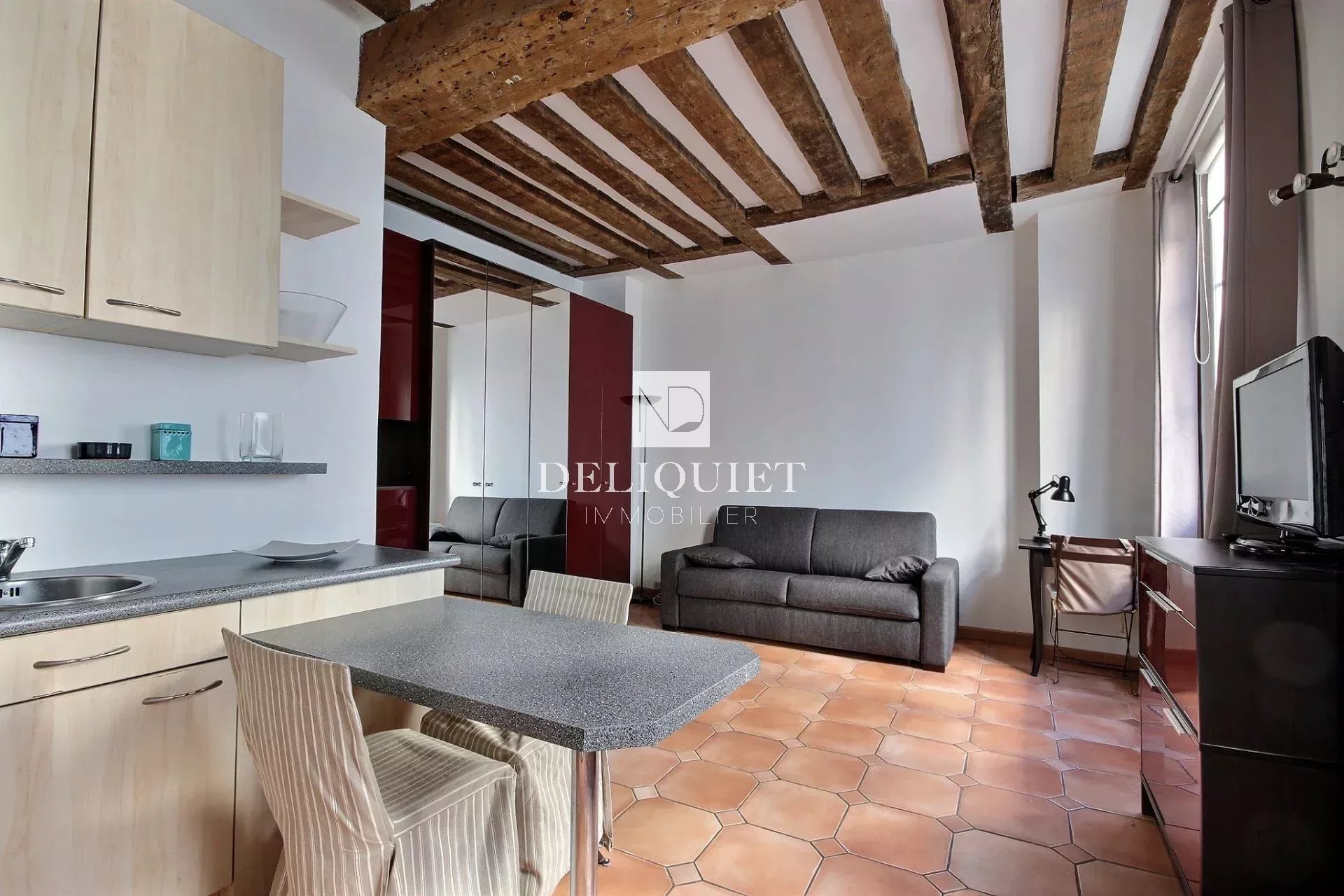 Paris 4e - Francs Bourgeois - Proche place des Vosges. Au 2e étage d'un immeuble bien entretenu, un studio en parfait état de 24,15m² loi Carrez proposé entièrement meublé et équipé composé d'une pièce principale avec cuisine ouverte et d'une salle de bains avec toilettes. Idéalement situé, ce bien lumineux offre de beaux volumes et a su conserver son charme d'origine avec ses poutres apparentes.