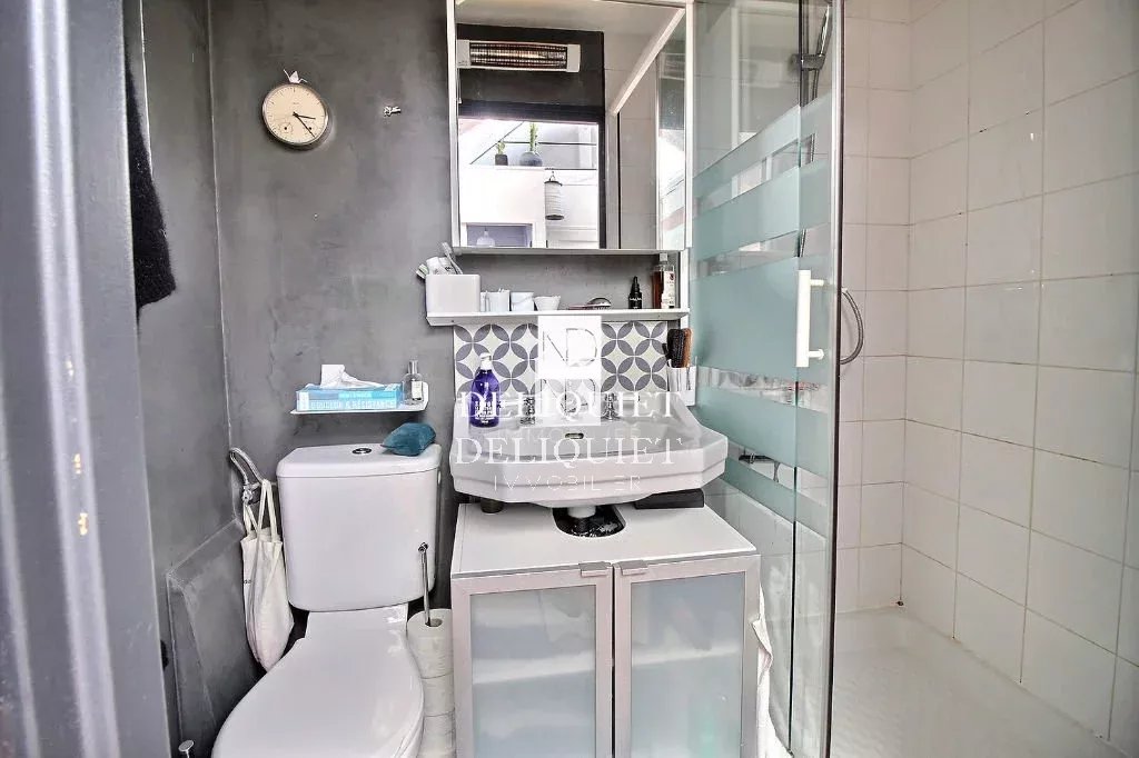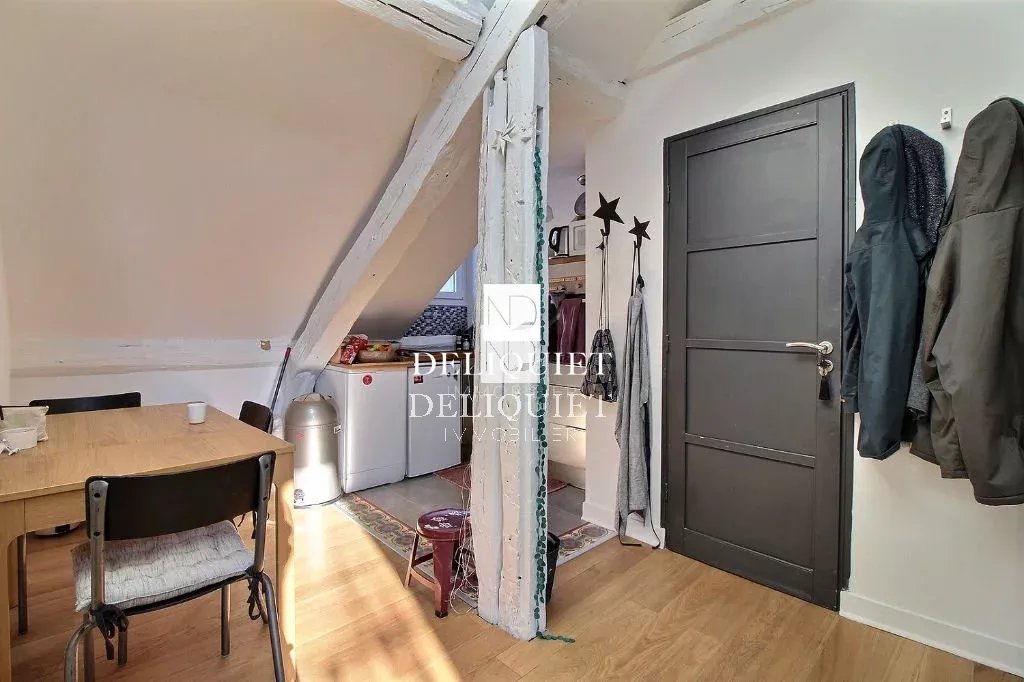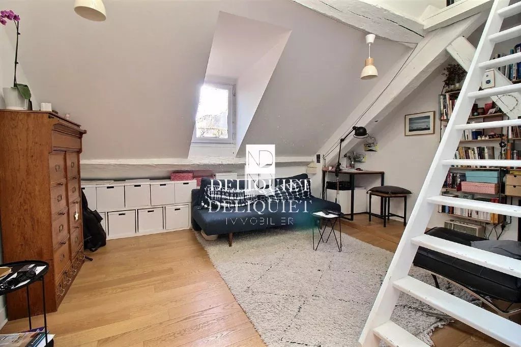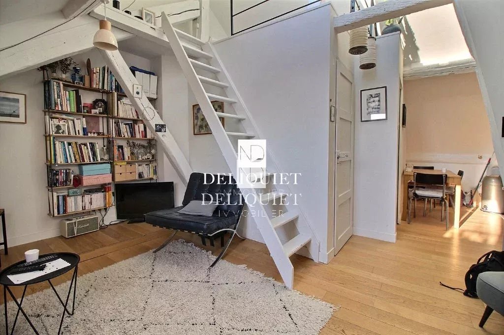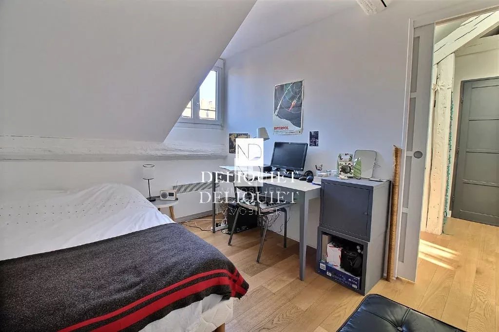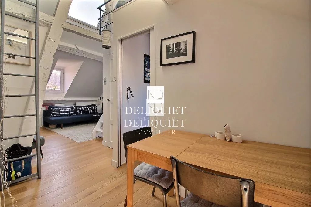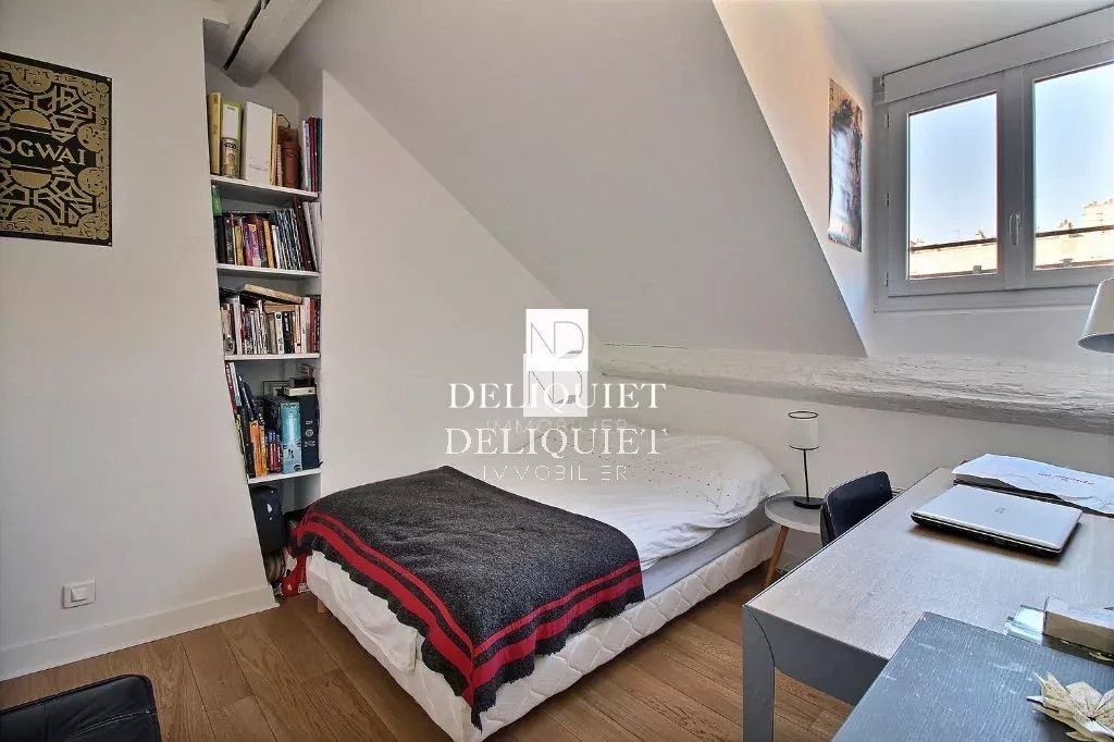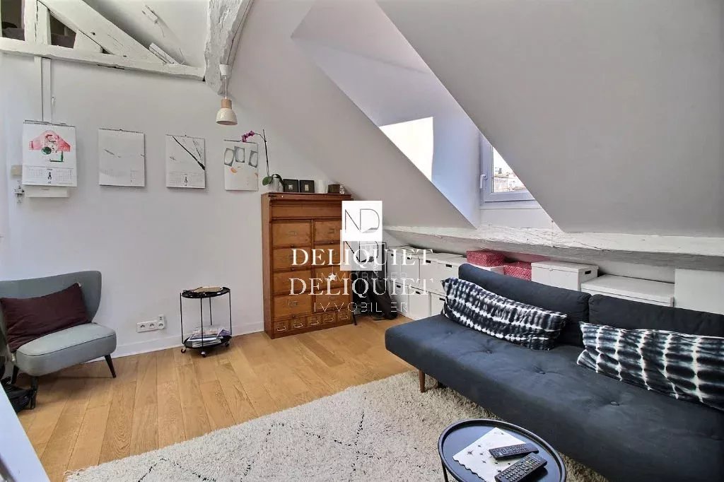 Paris 3e. Rue Notre-Dame de Nazareth. Au 6ème et dernier étage sans ascenseur, 2 pièces de 59,60 m2 utiles (34,52 m2 Carrez), composé d'une entrée, d'une salle à manger avec cuisine ouverte, d'un salon avec de nombreux rangements, d'une chambre, d'un dressing, d'une salle d'eau avec toilettes, et d'un coin couchage en mezzanine . Une cave complète cet ensemble. Offrant de beaux volumes, ce charmant 2 pièces rénové profite d'une belle luminosité, d'une absence de vis à vis et d'une vue sur Beaubourg.