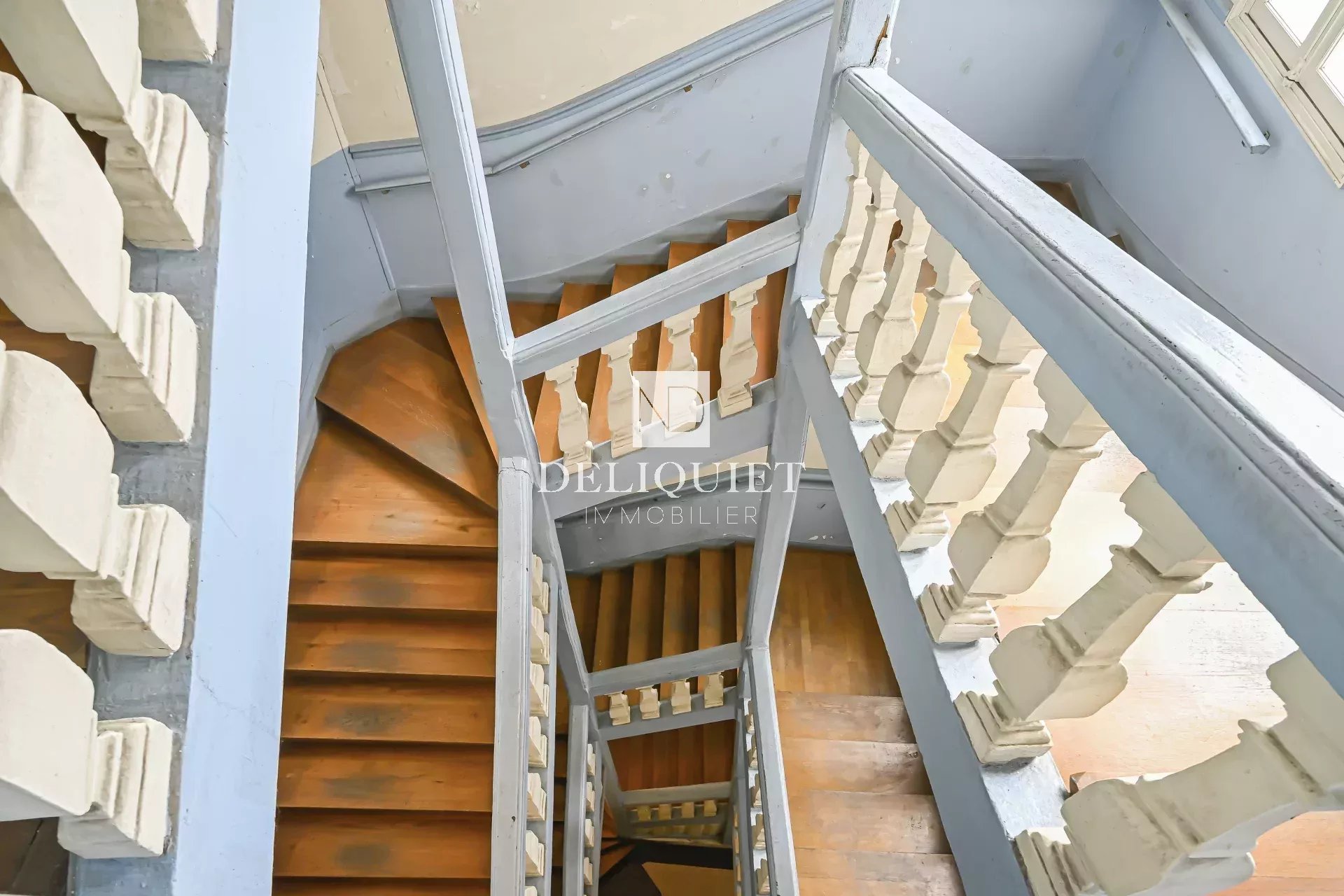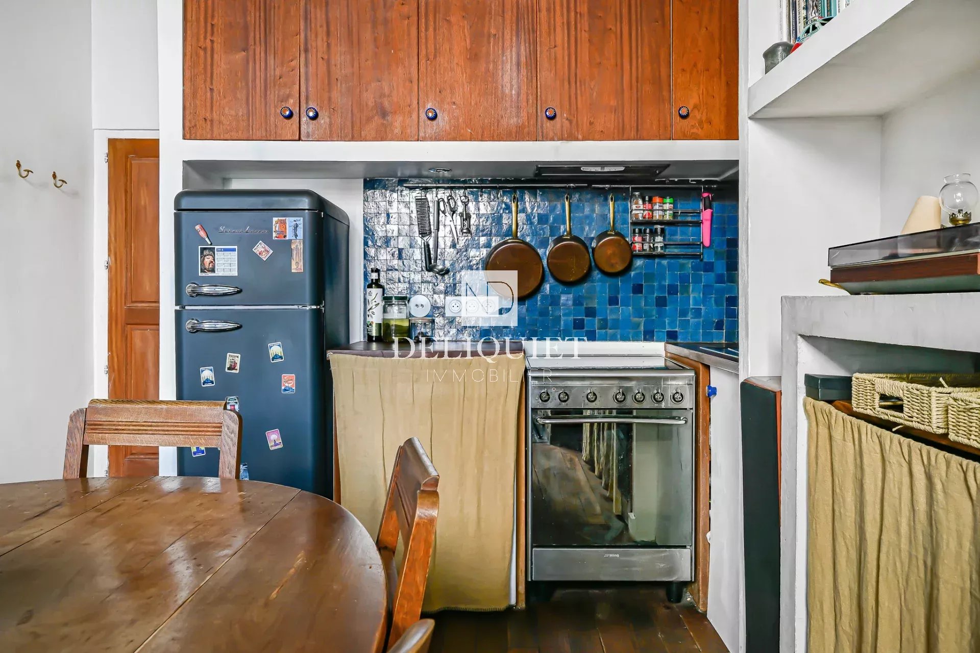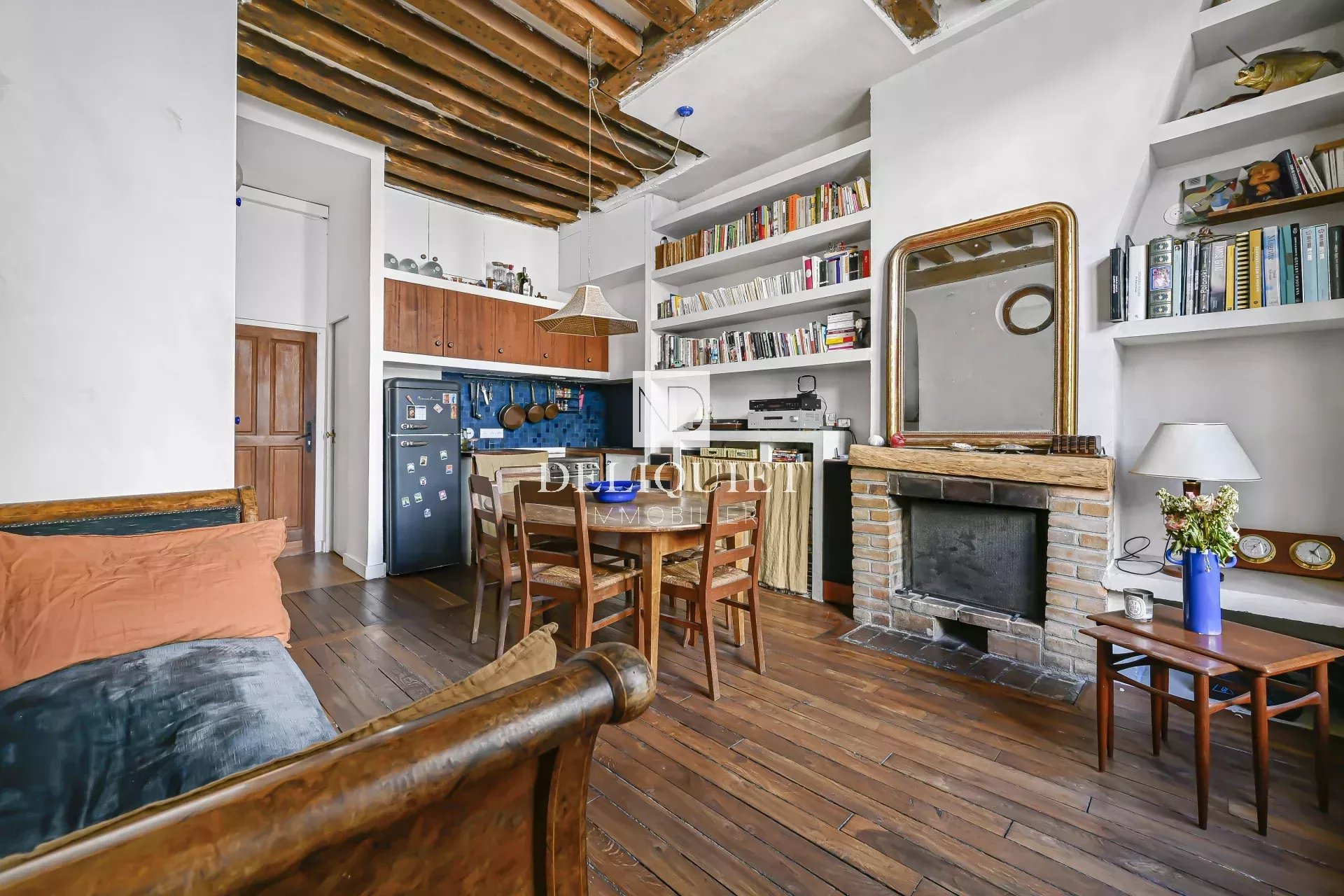 Cet appartement a su conserver son charme d'origine avec ses deux grandes fenêtres, sa belle hauteur sous plafond, ses poutres apparentes, son parquet en chêne massif et sa cheminée fonctionnelle. fonctionnelle