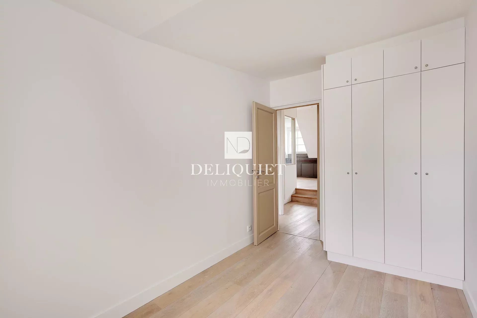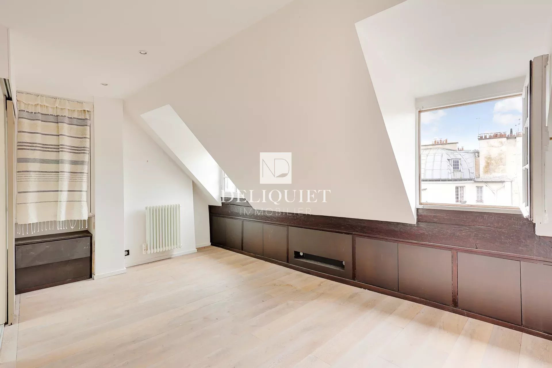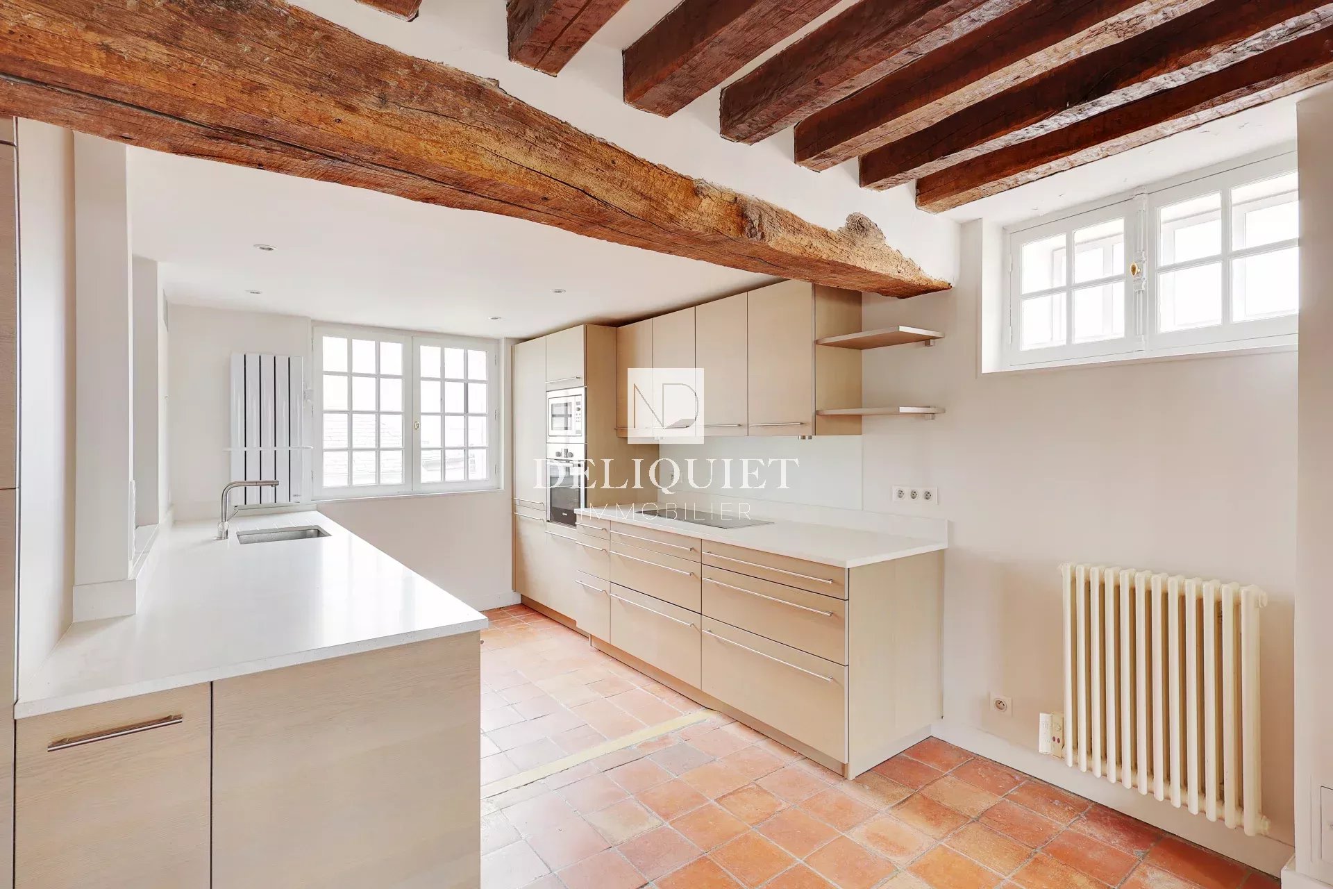 Paris 4e. Rue des Blancs Manteaux. Au 4e et dernier étage sans ascenseur d'un bel immeuble ancien typique du Marais et bien entretenu, 4 pièces de 93m3 Carrez (104,50m2 au sol) en duplex et en très bon état. Il se compose d'une entrée / bureau, d'un vaste double séjour traversant de 46m2 avec cuisine ouverte et d'un cabinet de toilette. A l'étage, une suite parentale avec sa salle d'eau / toilettes et deux petites chambres.