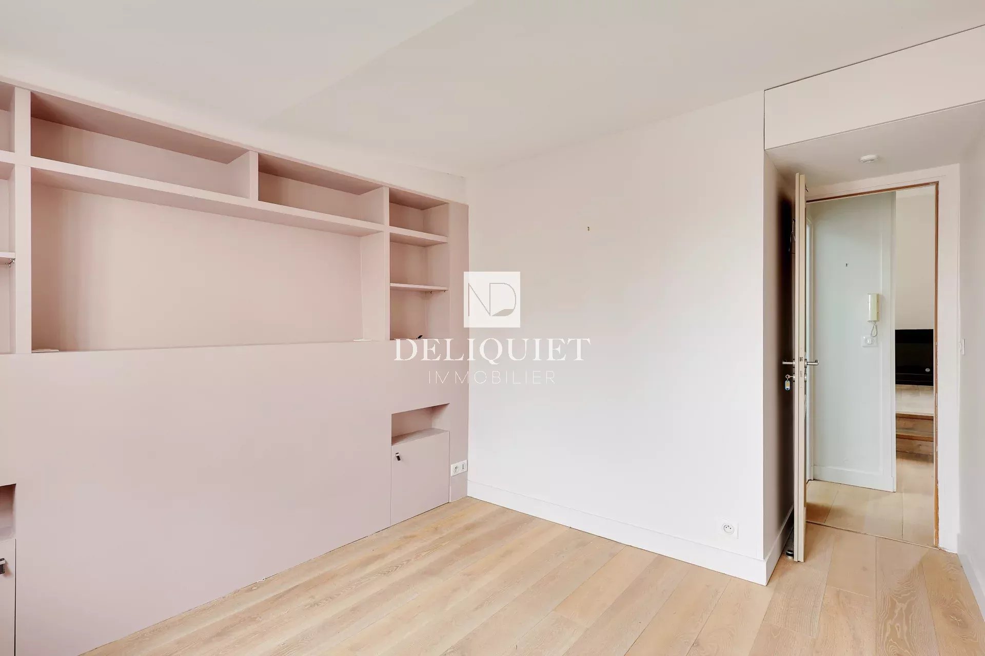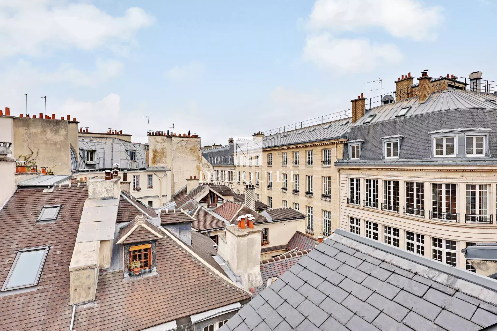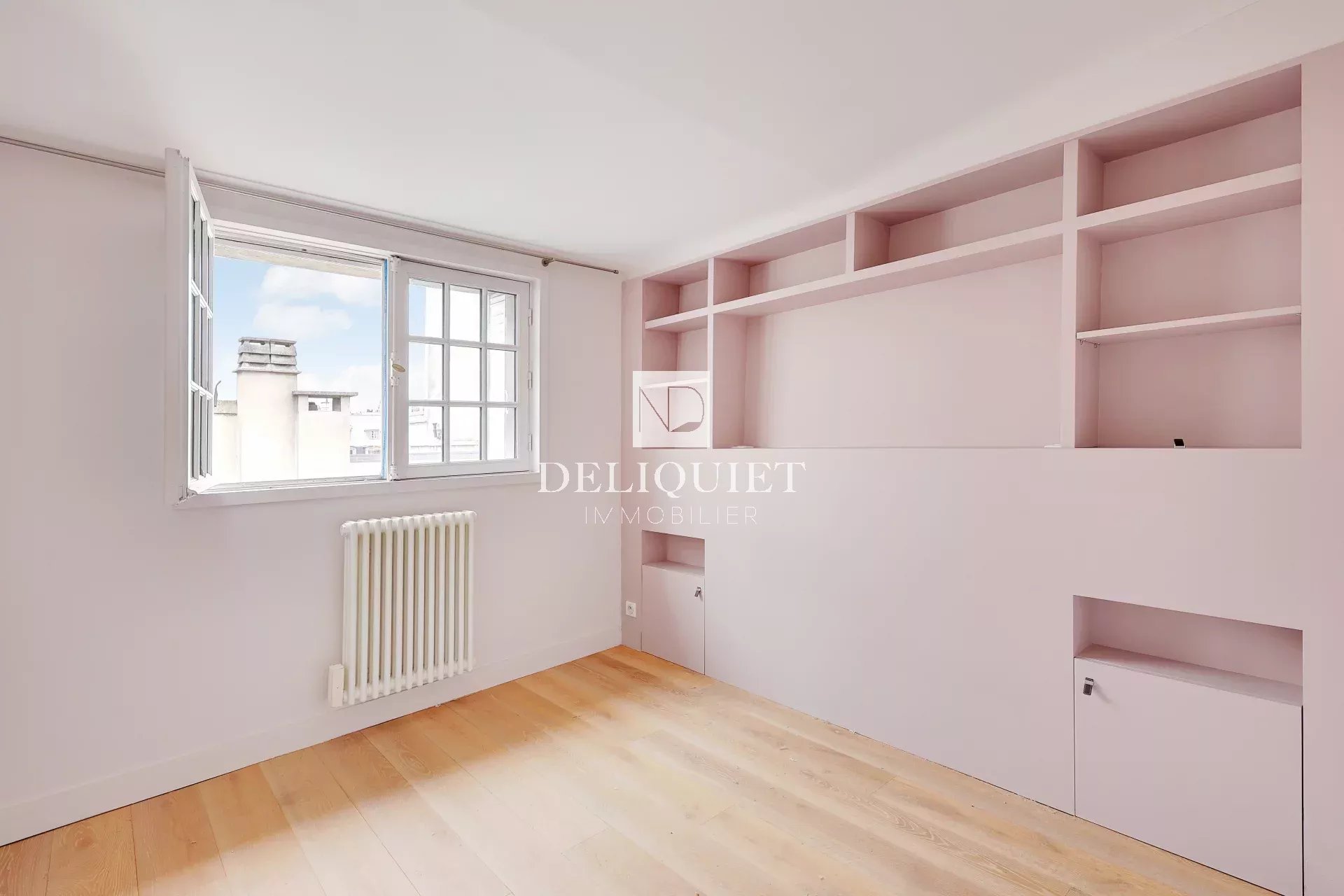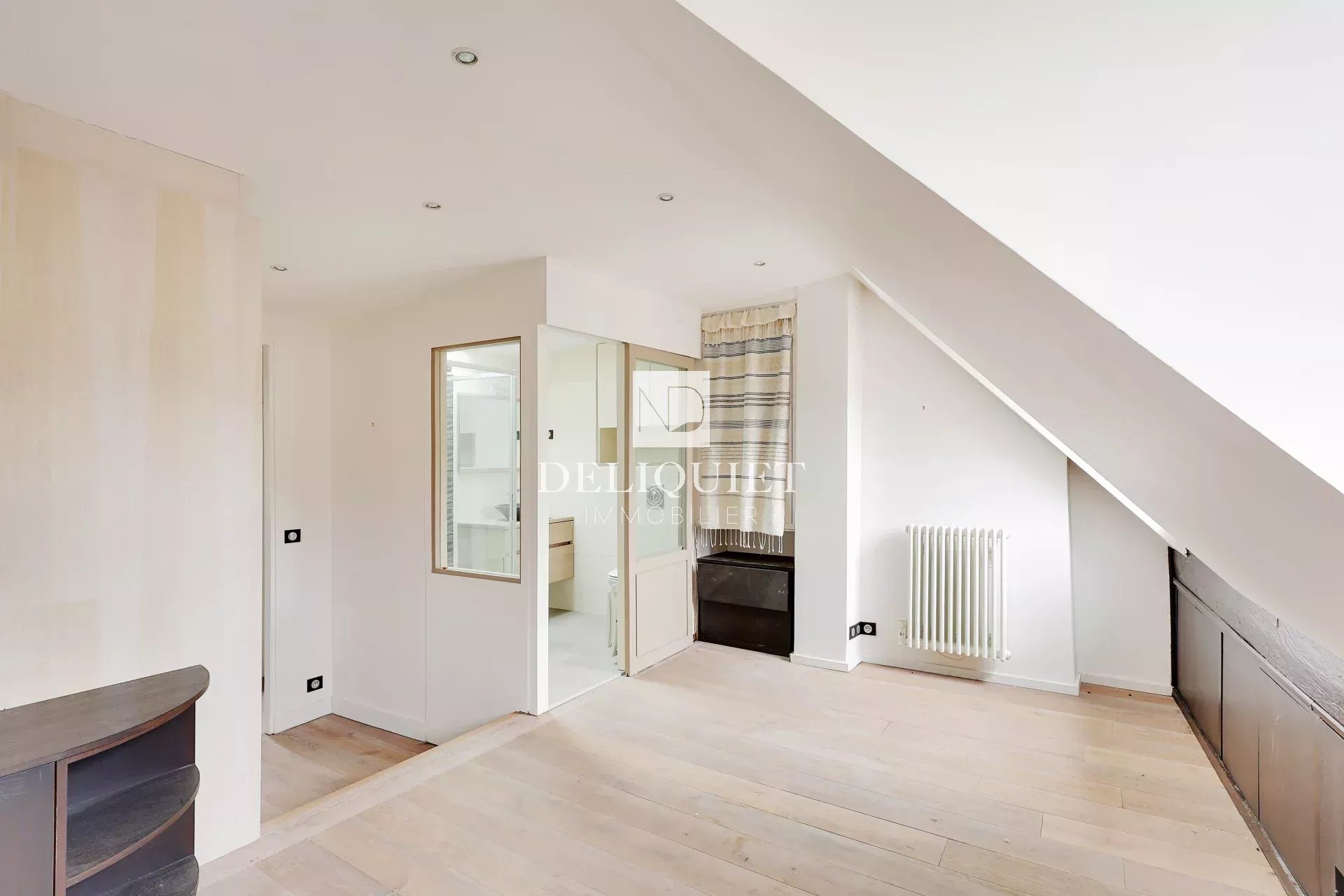 Paris 4e. Rue des Blancs Manteaux. Au 4e et dernier étage sans ascenseur d'un bel immeuble ancien typique du Marais et bien entretenu, 4 pièces de 93m3 Carrez (104,50m2 au sol) en duplex et en très bon état. Il se compose d'une entrée / bureau, d'un vaste double séjour traversant de 46m2 avec cuisine ouverte et d'un cabinet de toilette. A l'étage, une suite parentale avec sa salle d'eau / toilettes et deux petites chambres.